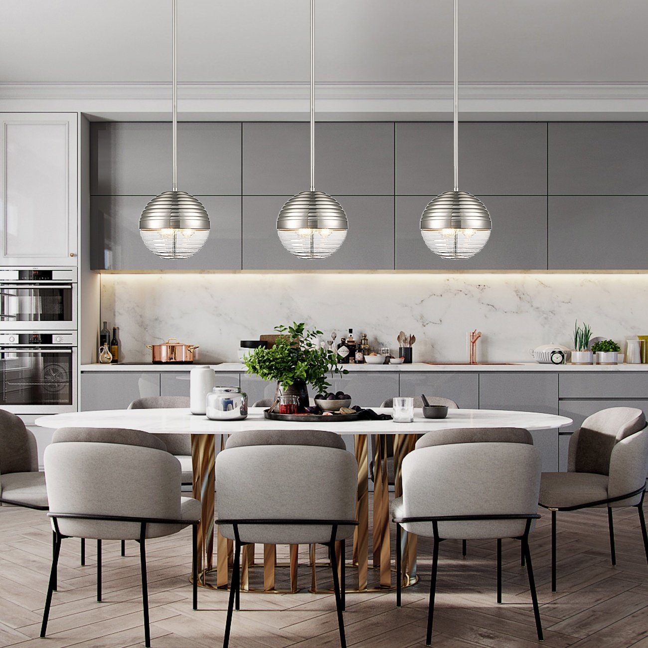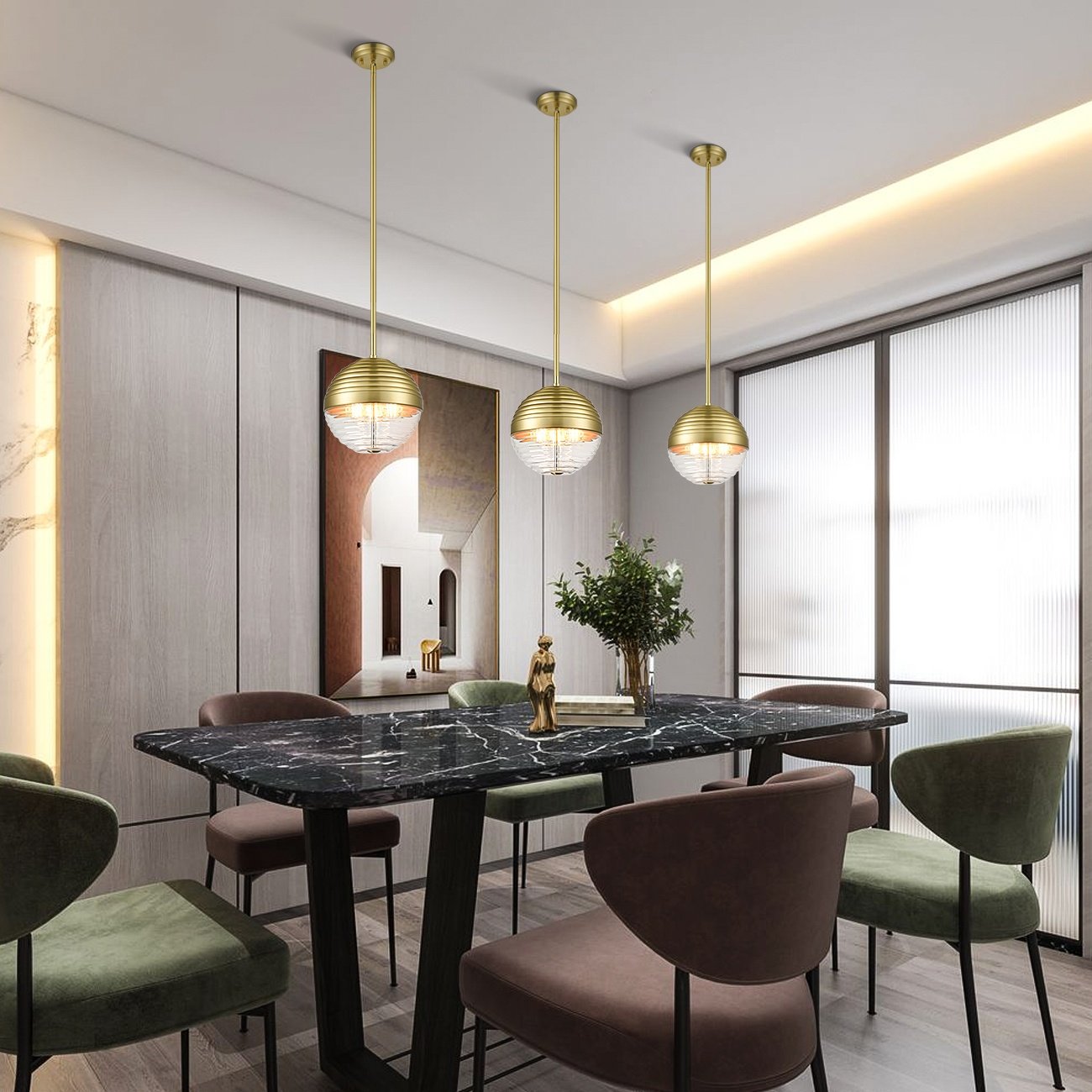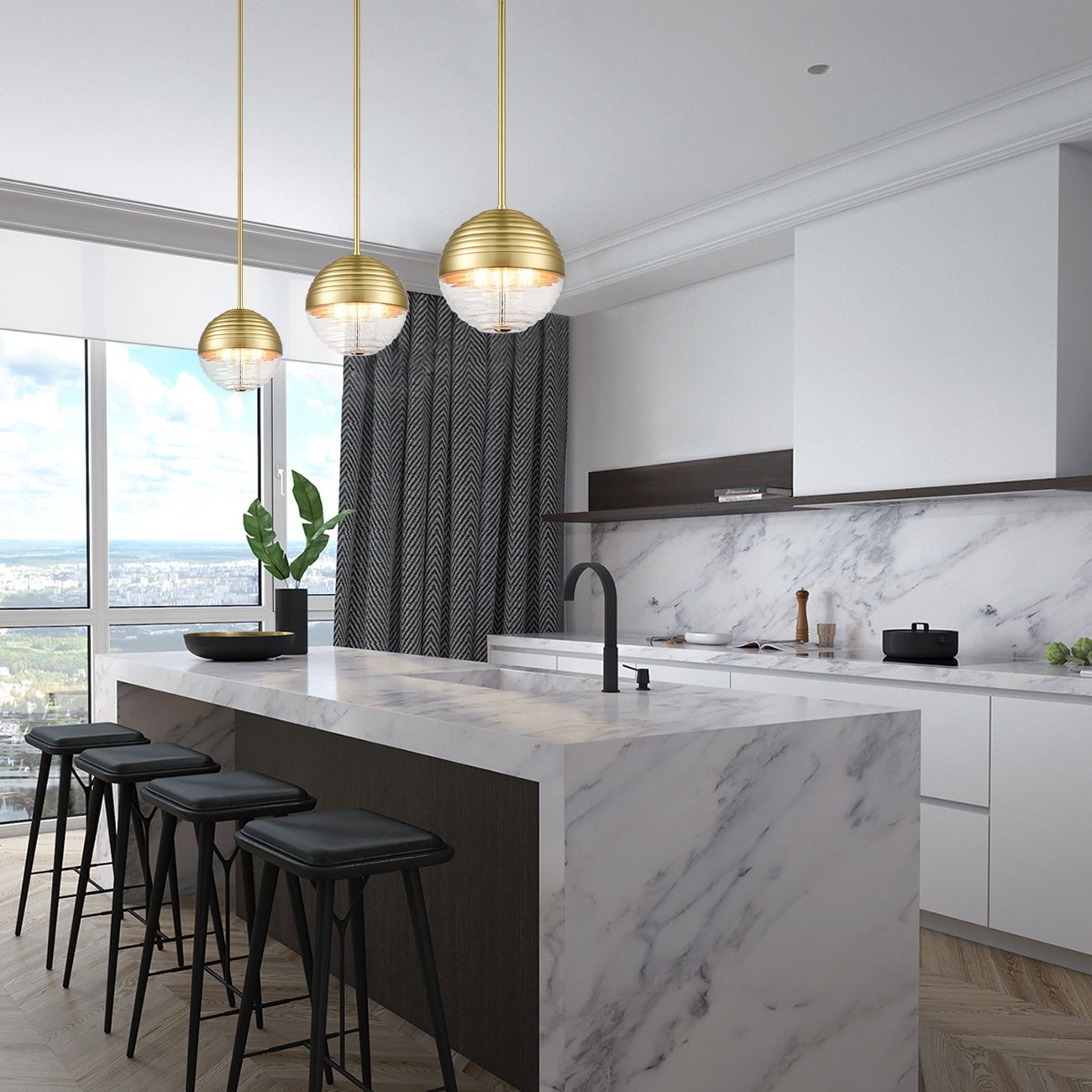 Our Bea Pendant Light in 3 finishes to choose from, brushed brass, black or satin nickel makes a simple statement you’ll love. A unique rippled glass shade creates visual intrigue, while light gently bounces off of the finish. Ready to perform solo, but also loves a crowd, our Bea pendant would be stunning above your kitchen island or sink, and would make waves in your foyer, or hallway.