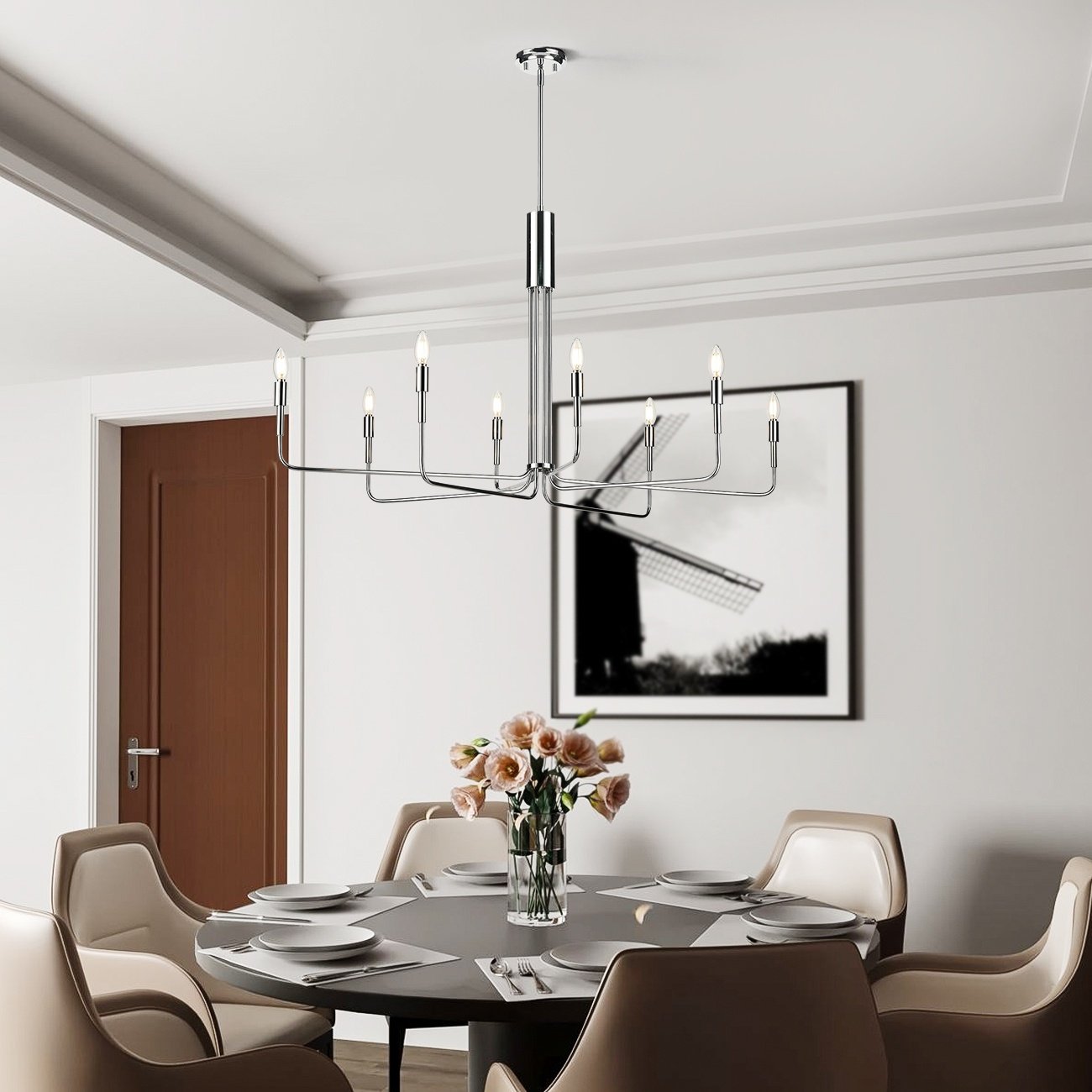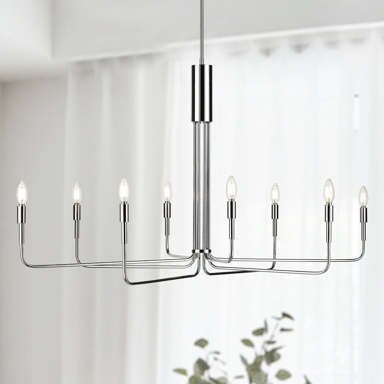 I used this light in a client’s home and loved it so much that I ordered it for my own home! This is a graceful and stunning large scale fixture. The arms are able to be positioned to suit your space - round or oval type. It’s stunning!