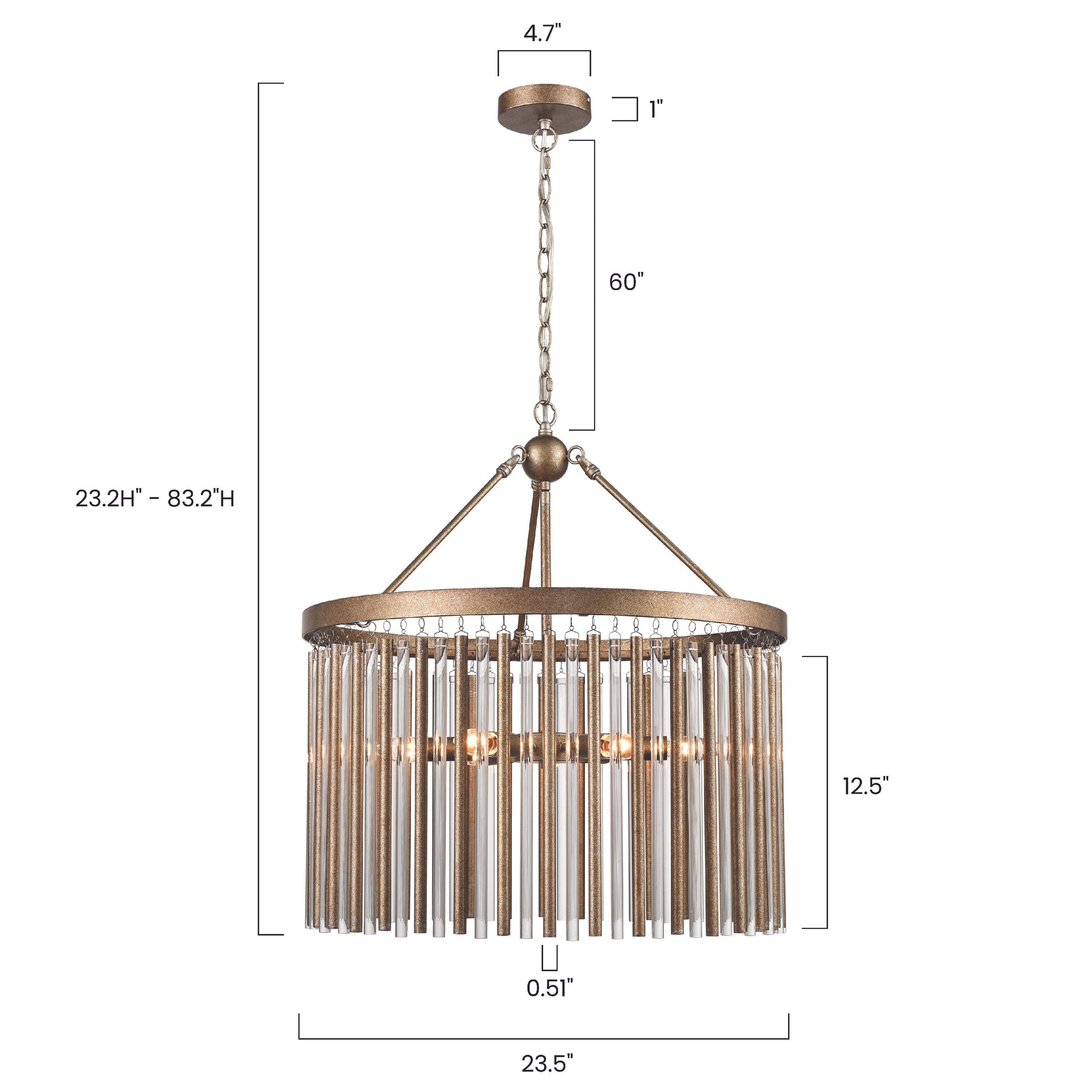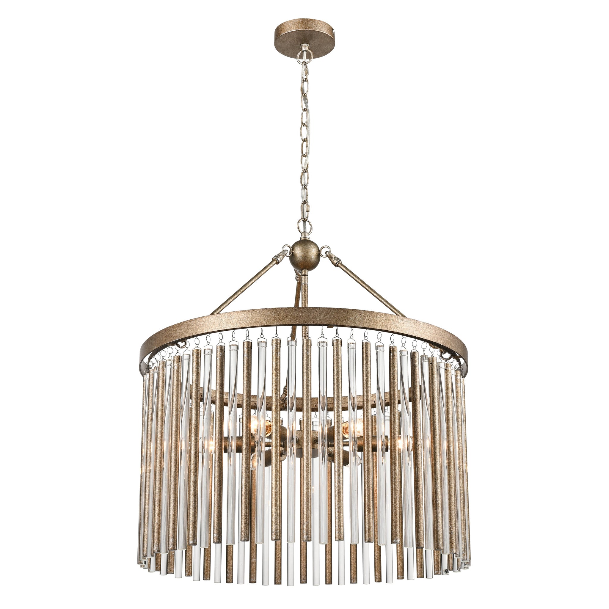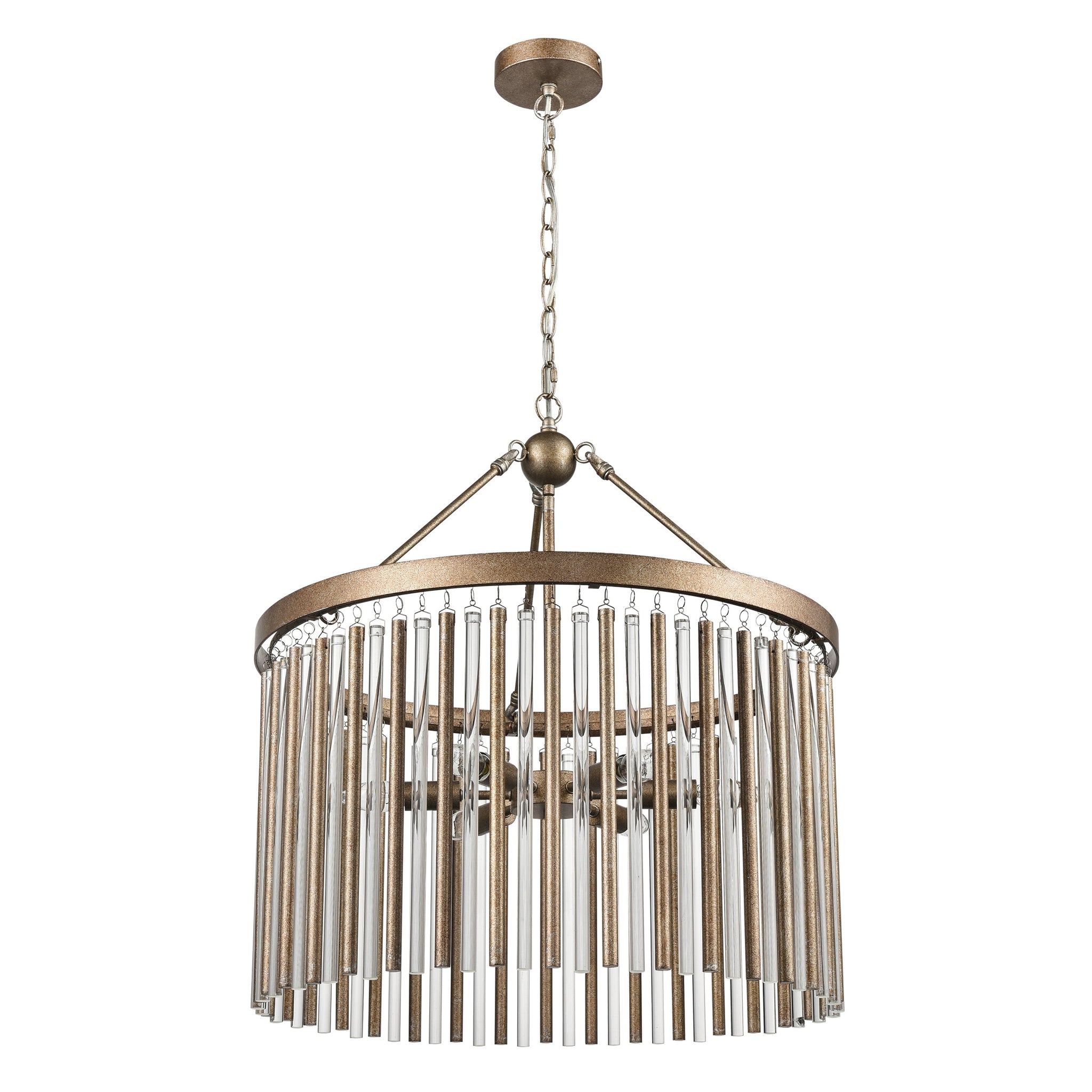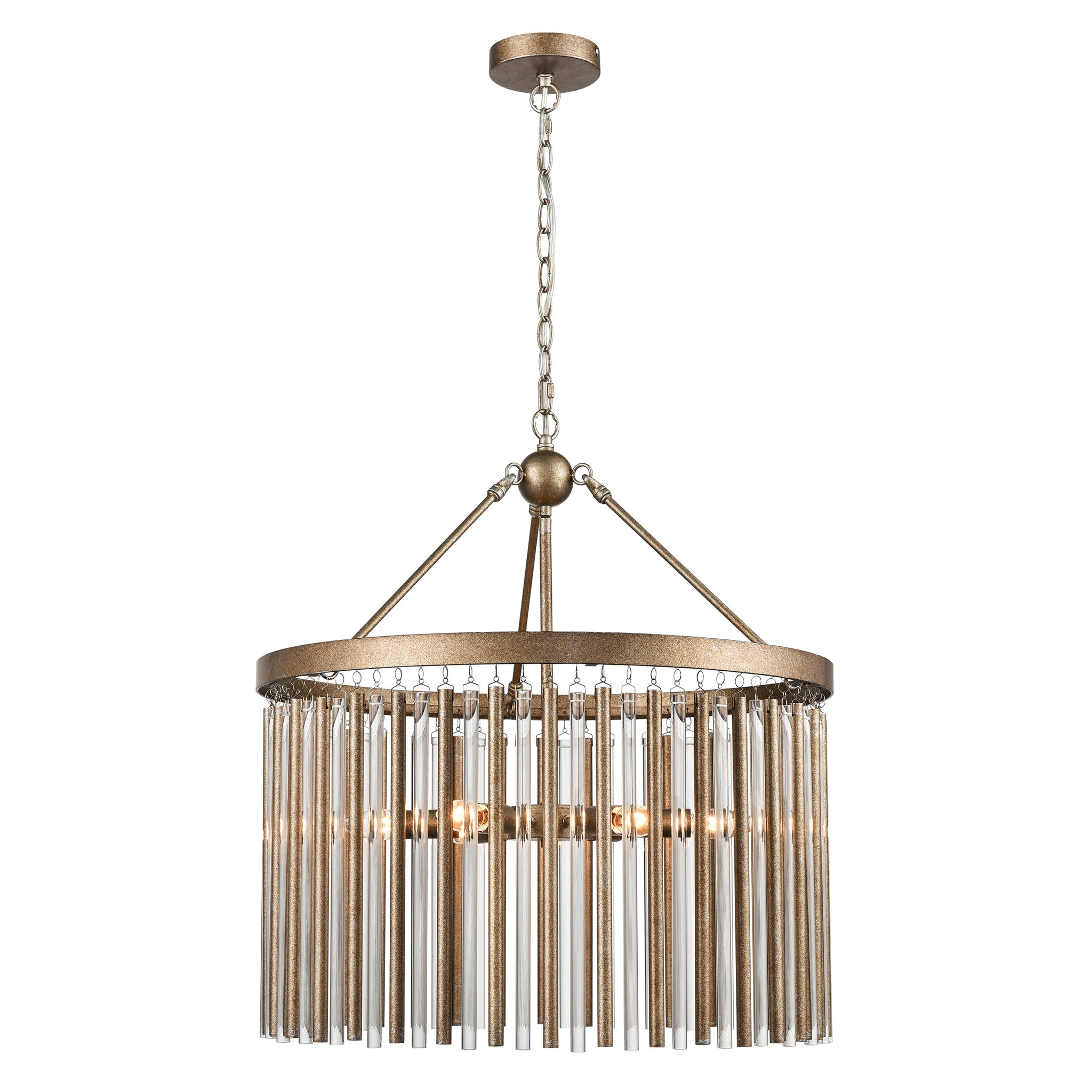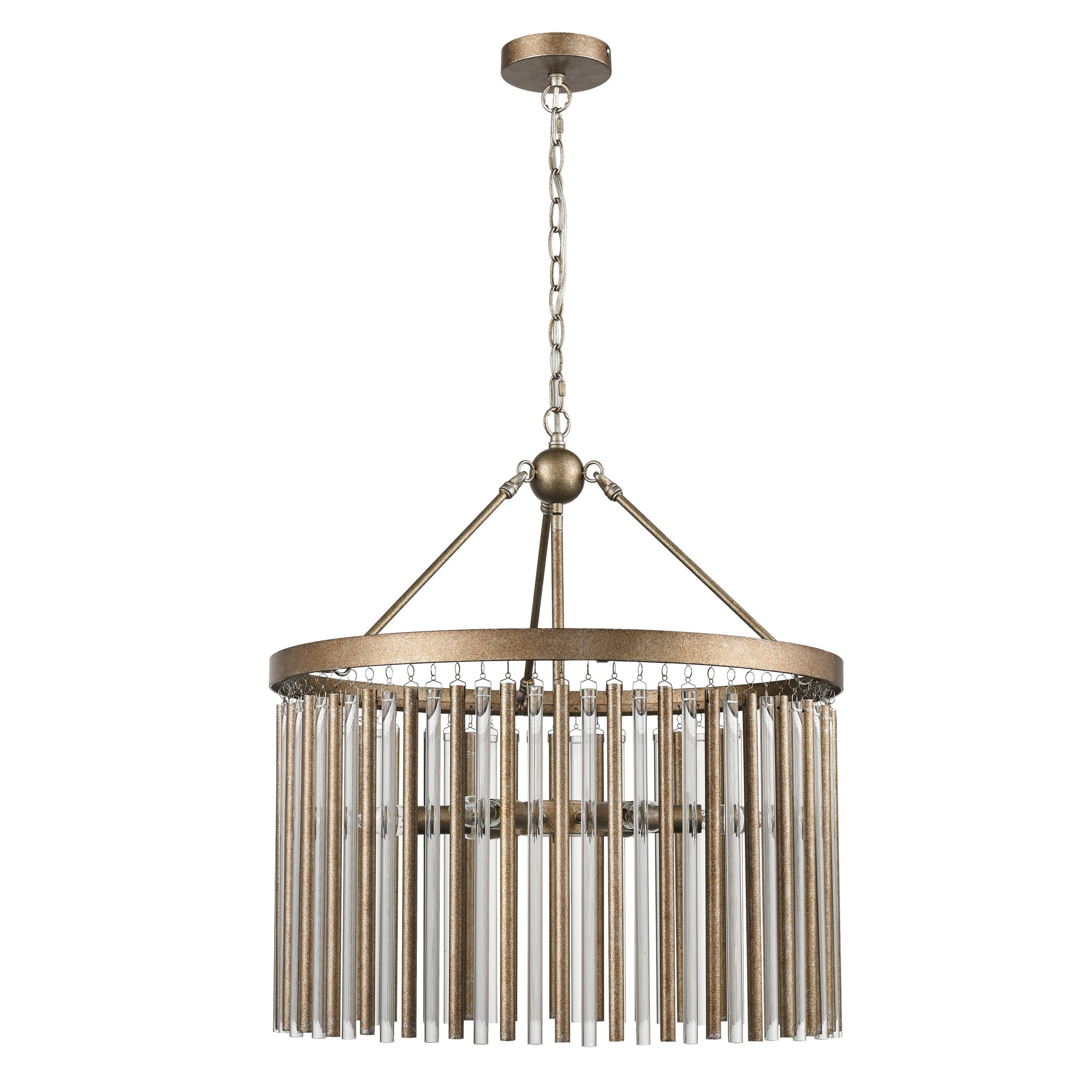 Impeccably styled and polished details are at the heart of our Elena Chandelier’s design. Alternating rods of crystal clear glass and antiqued brass create an appearance that’s elegant and dramatic all at once. Six lights shine through the glass, producing an amazing atmosphere— we see you hosting friends and family in your near future.