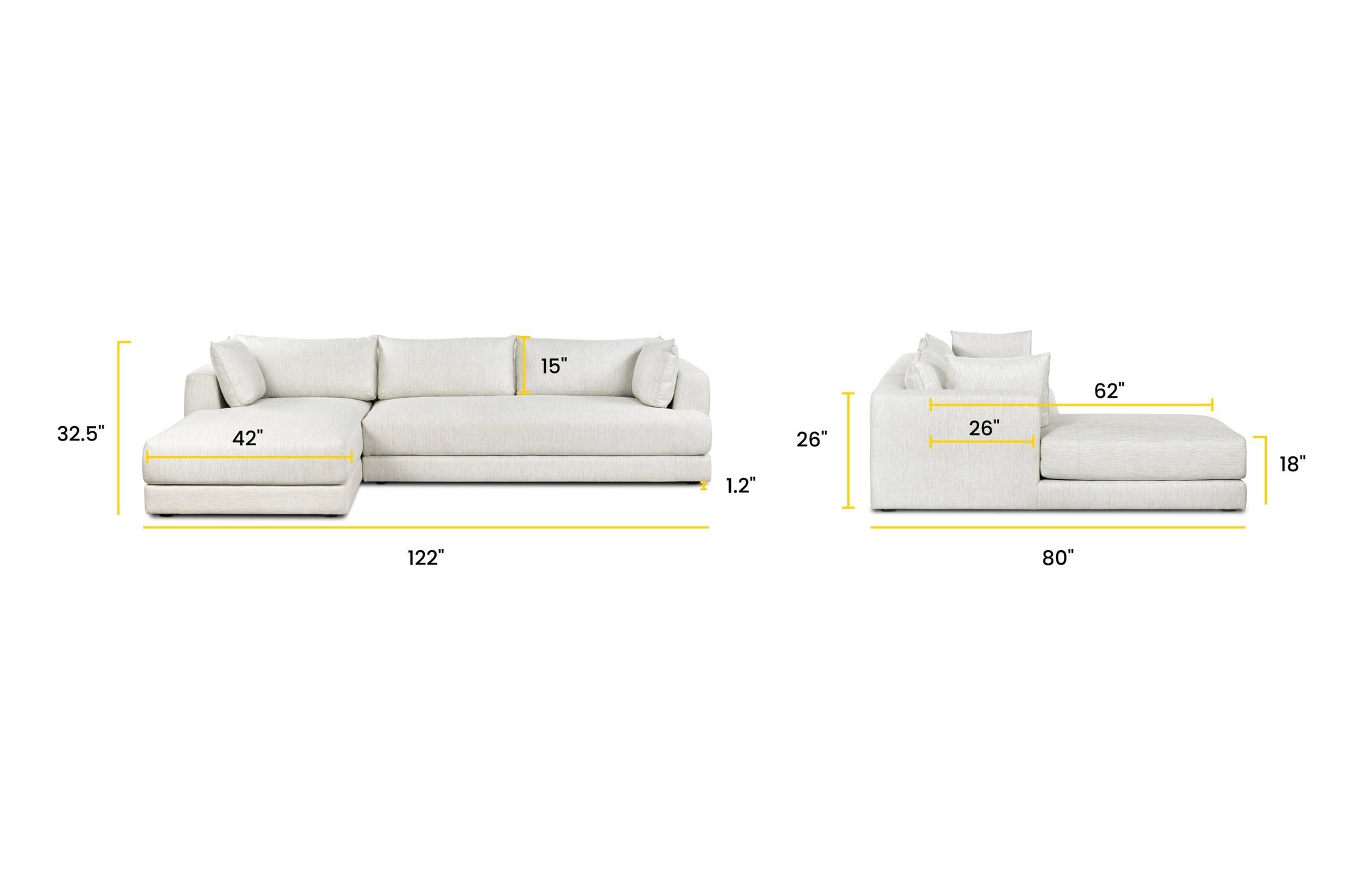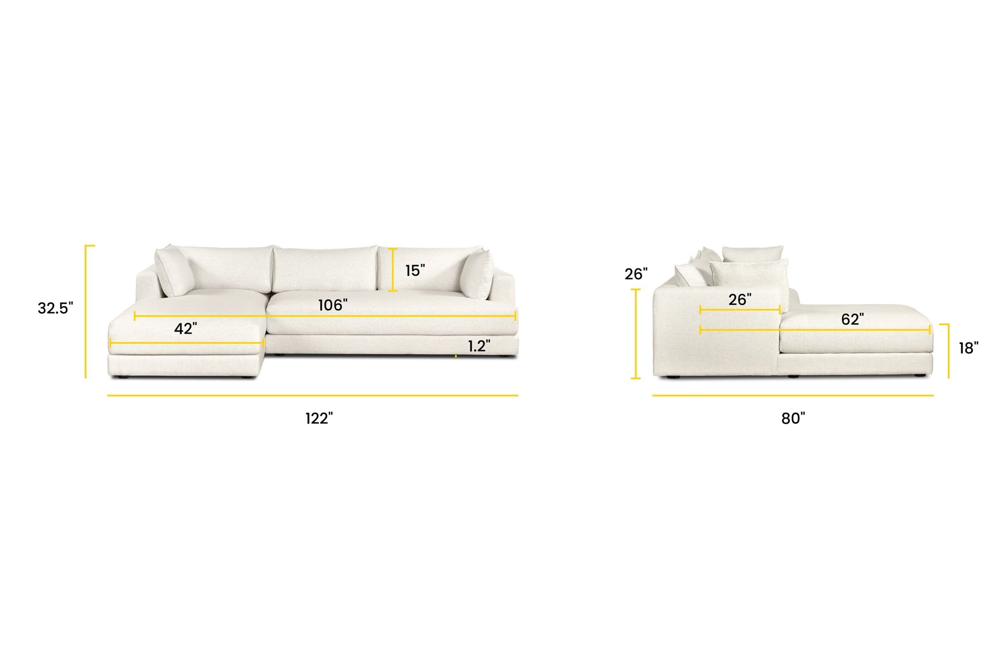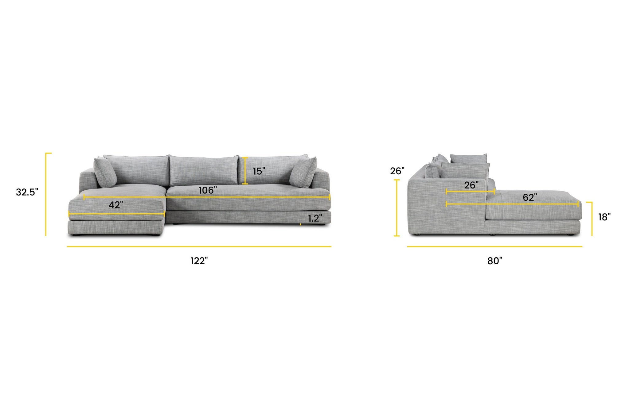 Seating Dimensions: 105"W x 62"D Chaise – 26"D Loveseat (until back cushion) x 18"H