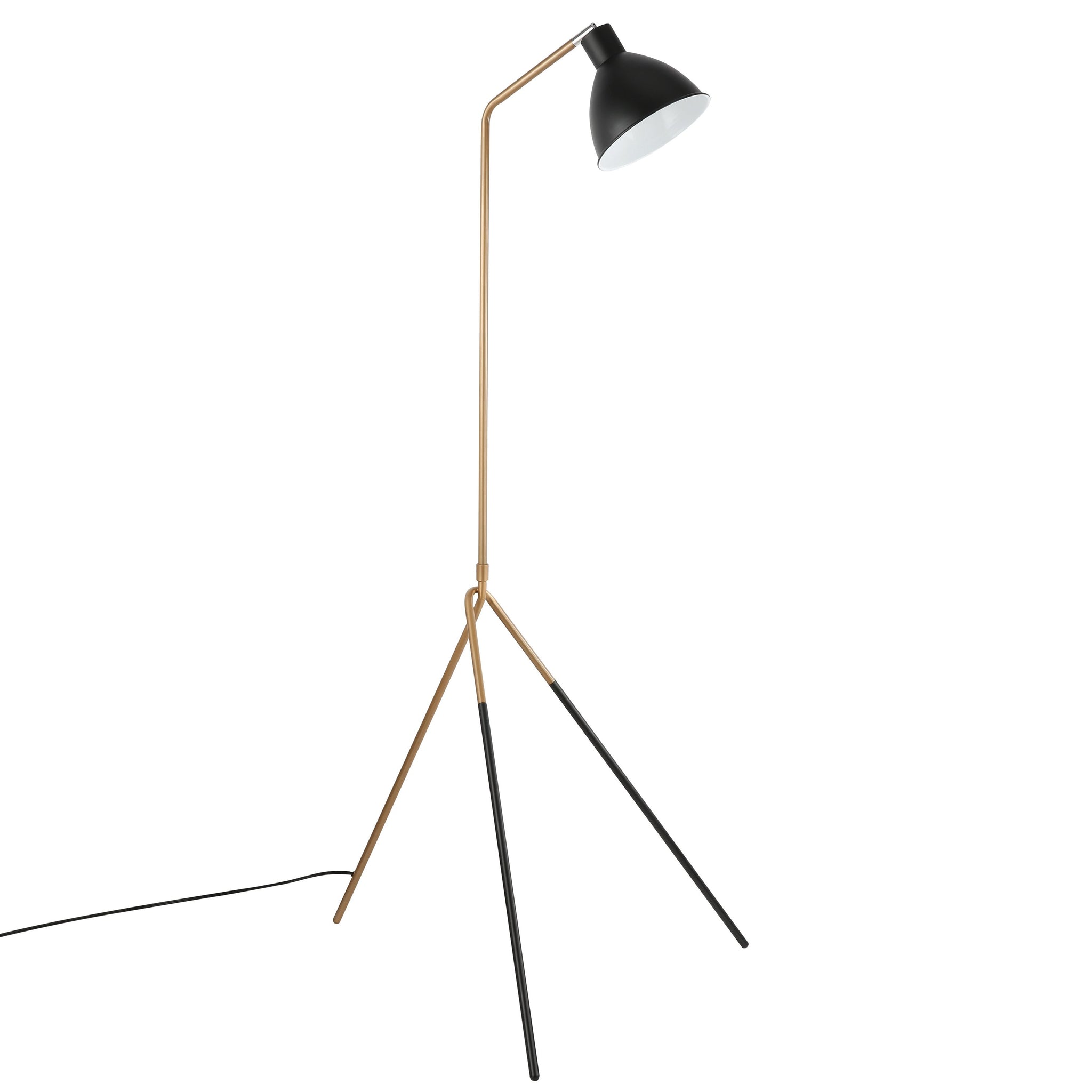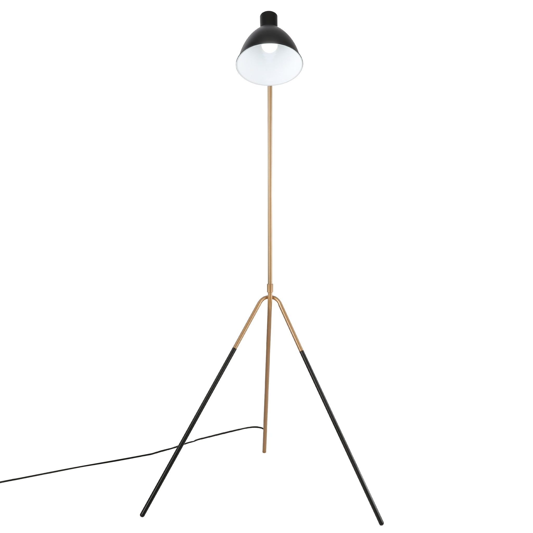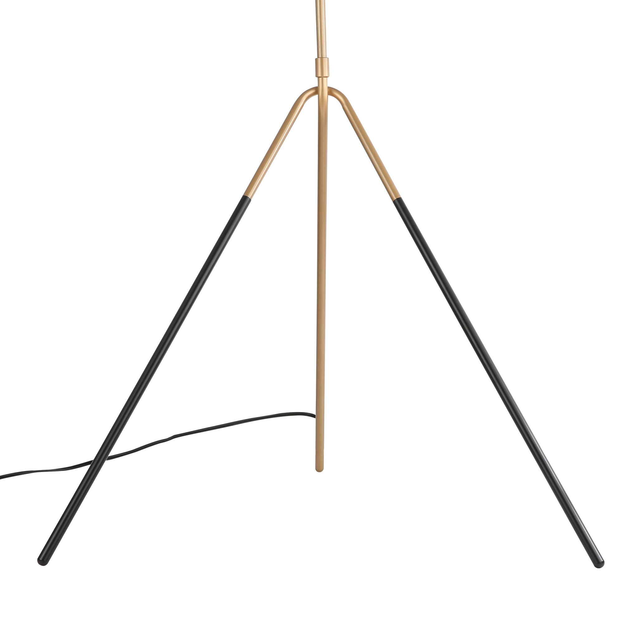 A modified tripod base and cool two-tone finish create a compelling composition for this metal floor lamp. Gorgeous in gold and black, a slender silhouette lends a crisp, modern look. Charming in minimalist decor, the lamp features a familiar shade silhouette, offering directional illumination to highlight a favorite space.