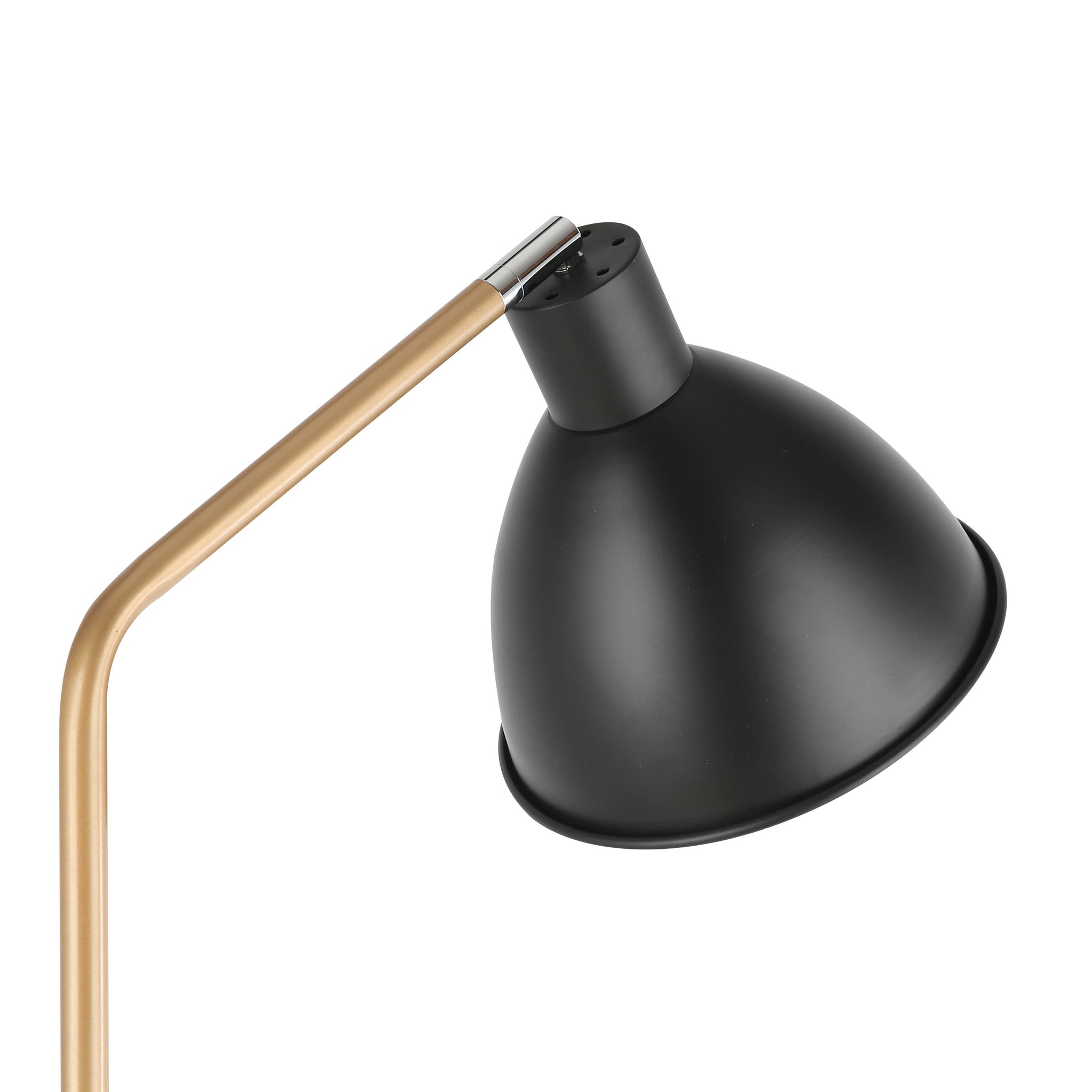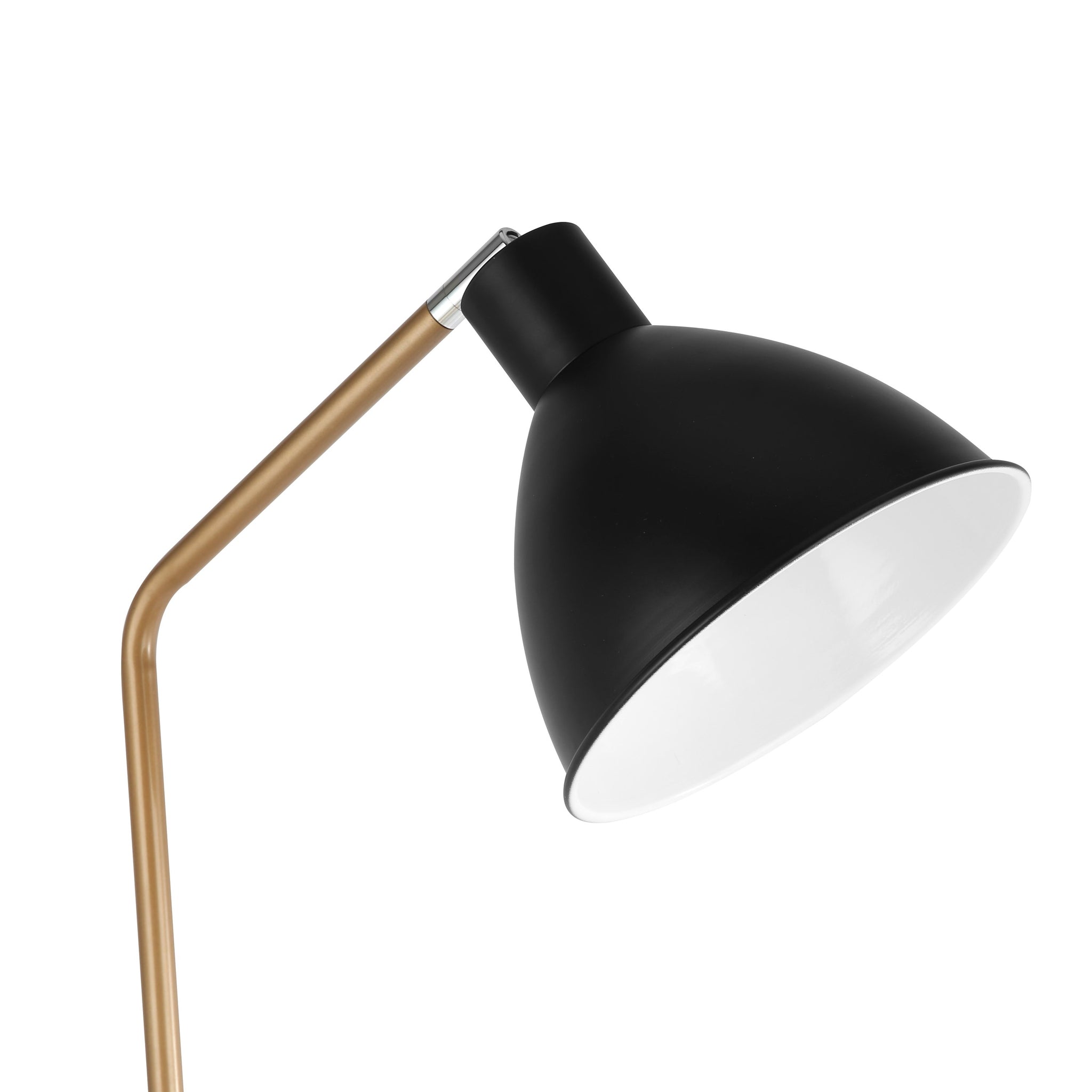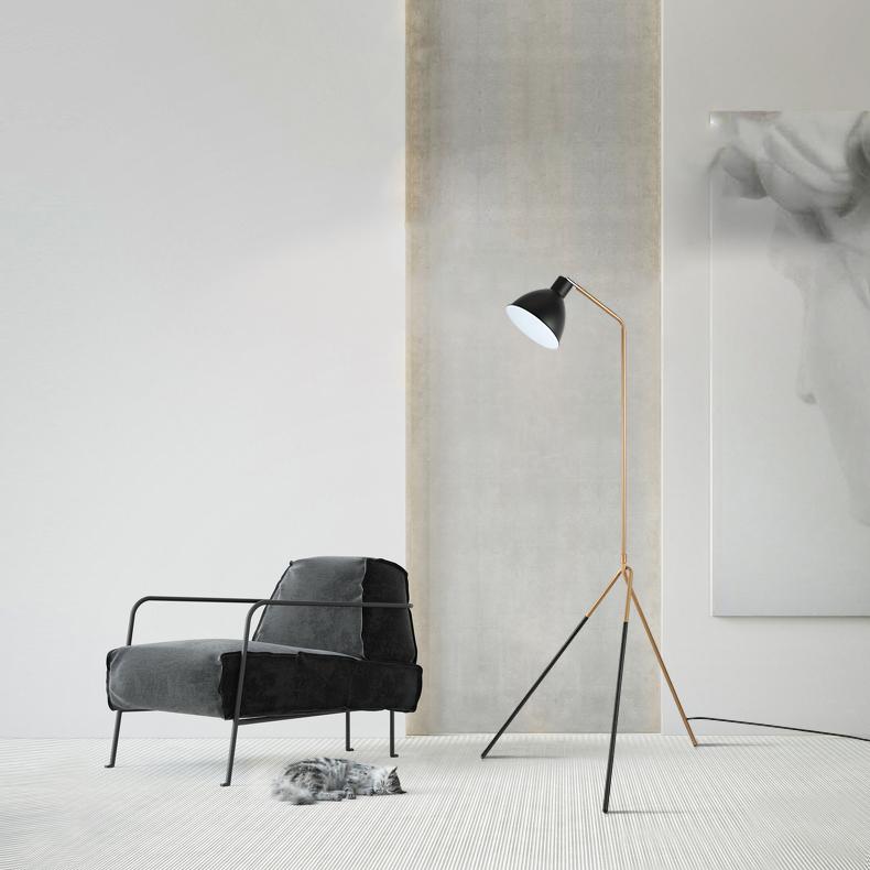 A modified tripod base and cool two-tone finish create a compelling composition for this metal floor lamp. Gorgeous in gold and black, a slender silhouette lends a crisp, modern look. Charming in minimalist decor, the lamp features a familiar shade silhouette, offering directional illumination to highlight a favorite space.