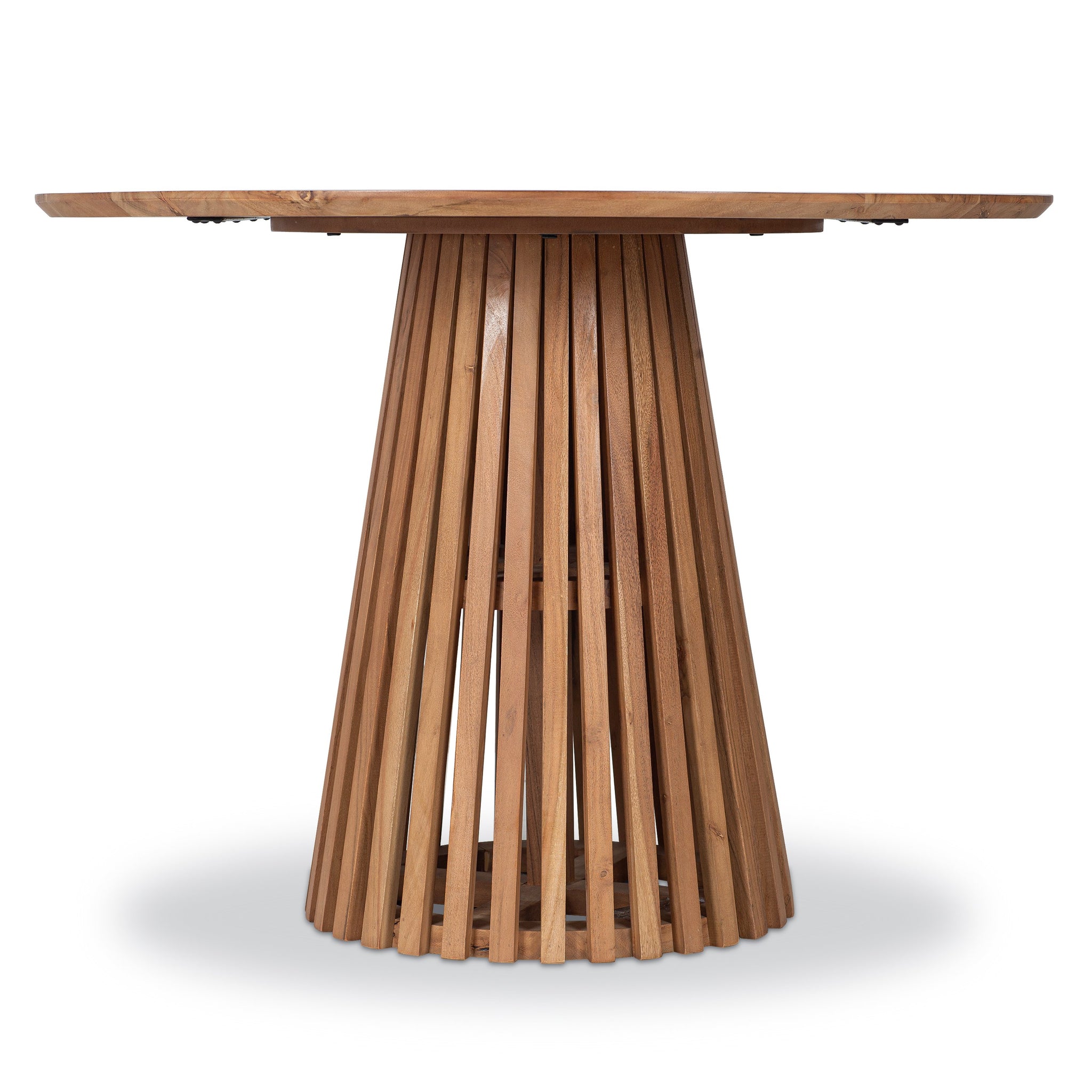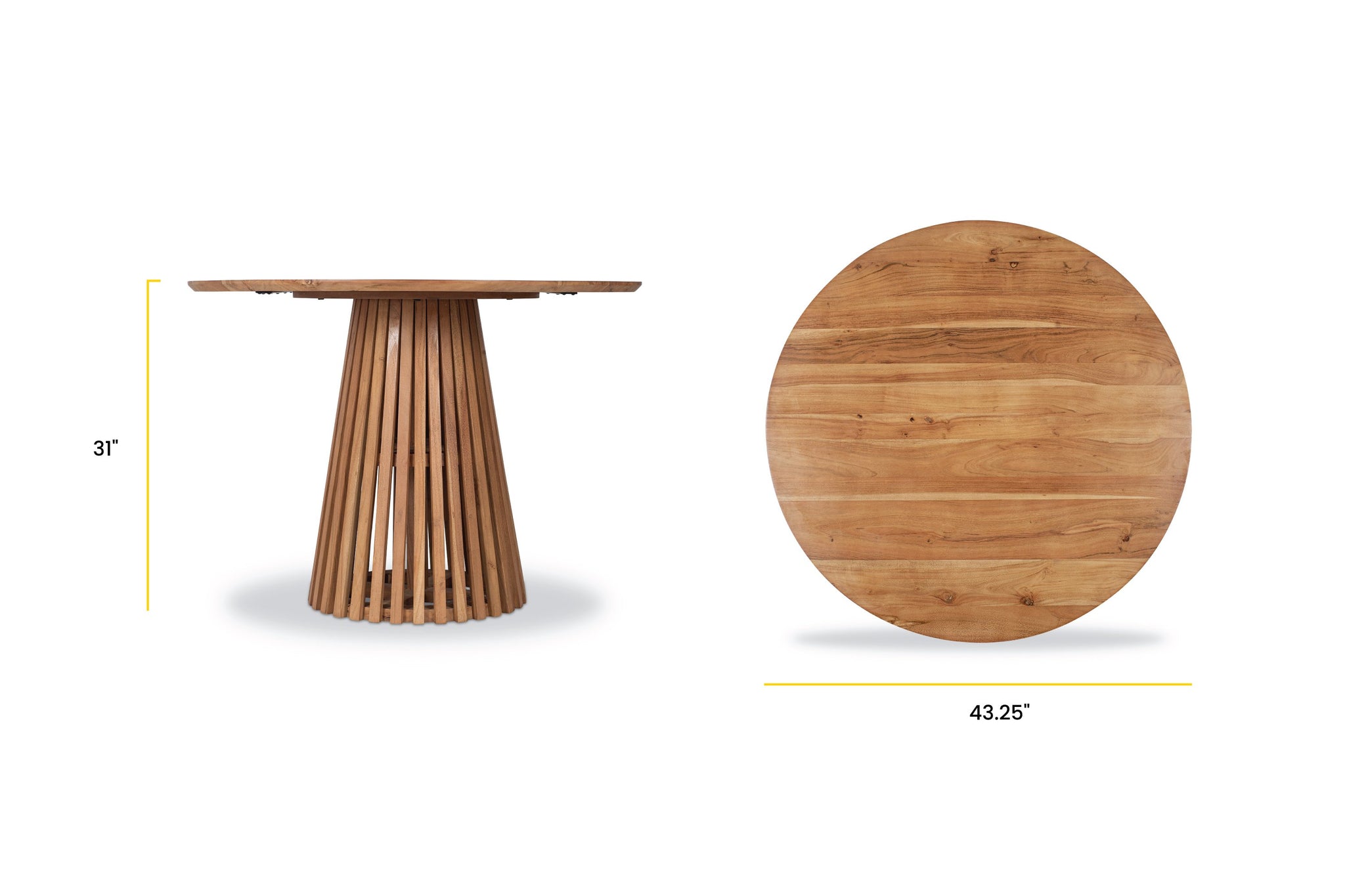 Entertain your tight-knit group for an intimate evening at our Gigi Dining Table. This round dining table is crafted using kiln-dried acacia wood that’s known for its gorgeous light and dark wood grain variations. This table’s slatted and tapered base is truly something to behold. The open and airy chairs you choose to accompany this table will help reflect its beautifully organic and unique design.