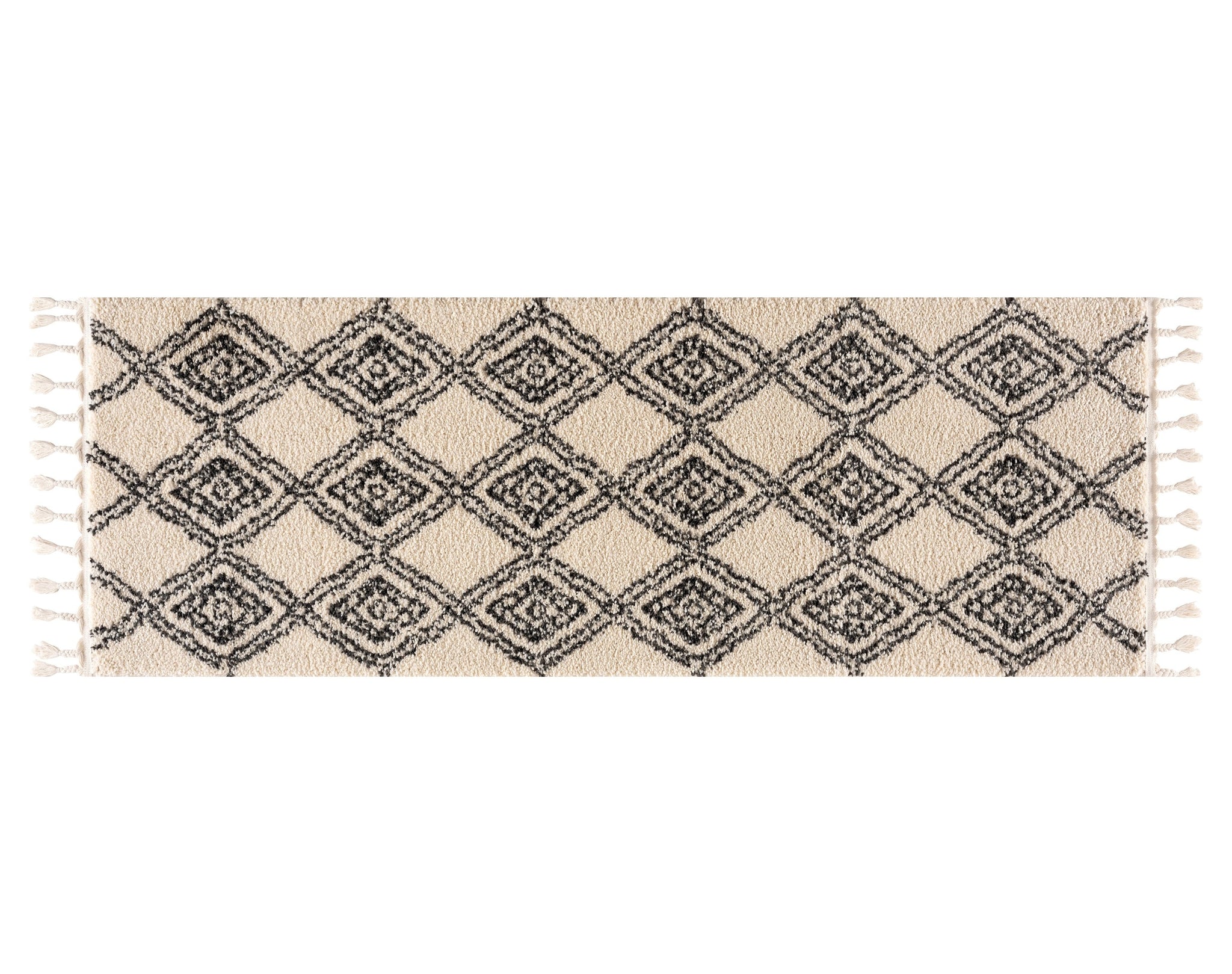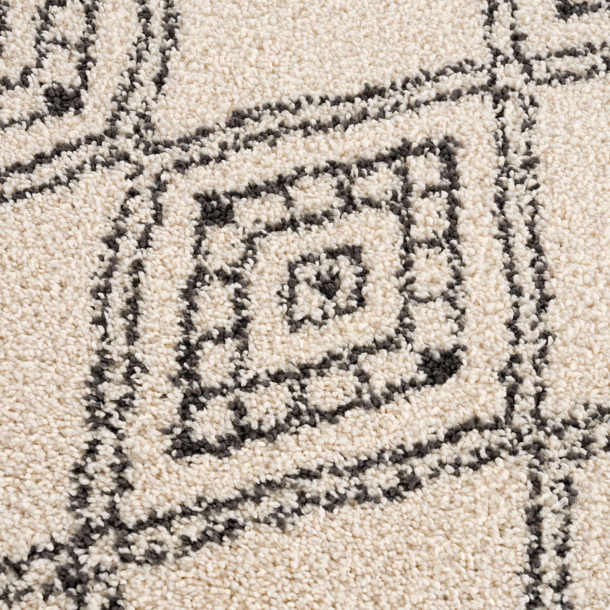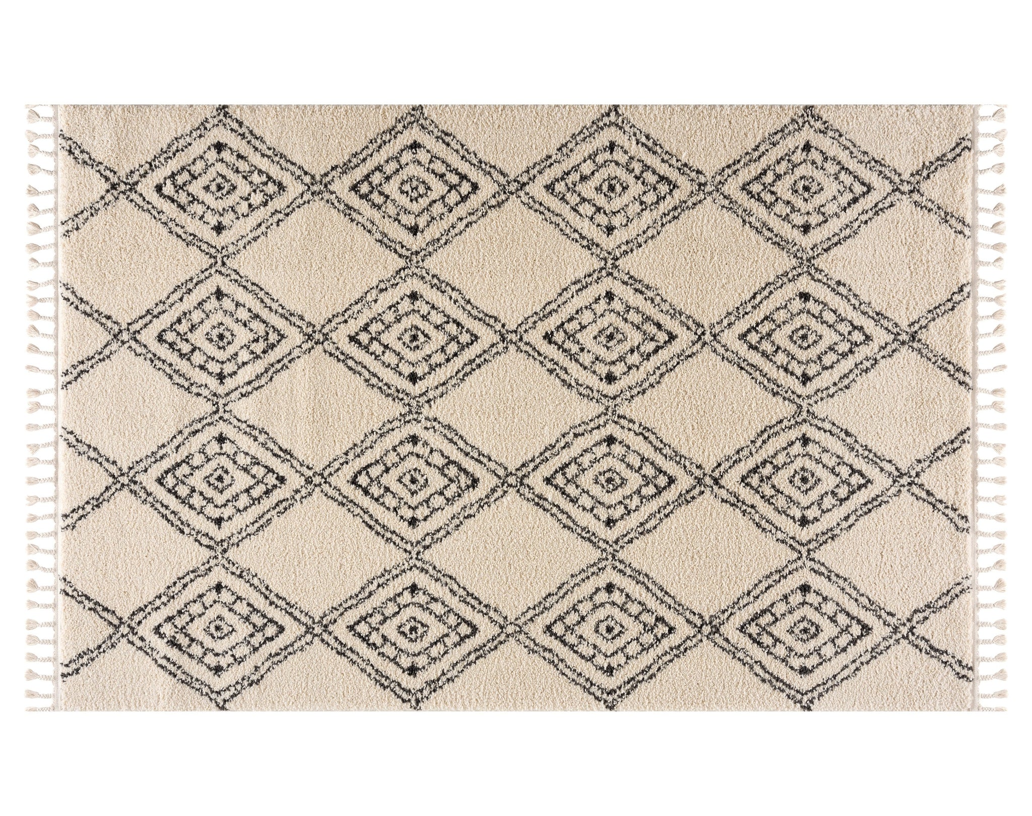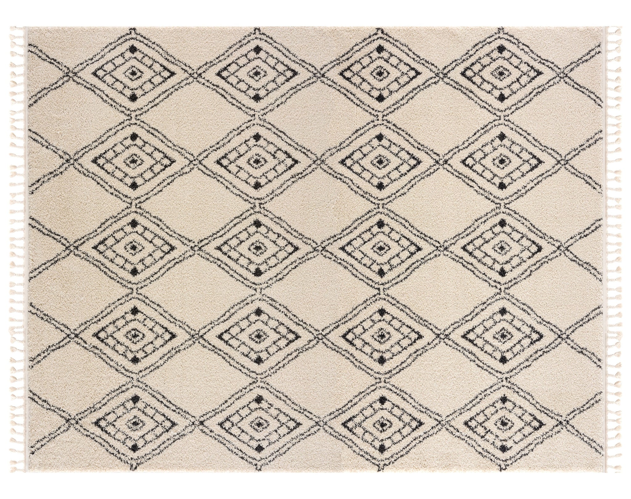 The epitome of neutral shades with a Moroccan motif, our Meru Shag Rug pleases every aesthetic. With a black, whimsical diamond pattern (that almost looks like a hand drawn work of art) atop a cream base, this rug brings undeniable comfort. Perfect in dining rooms, bedrooms, and family rooms because of its super-plush two inch thick pile, this rug will easily fit into your lifestyle.