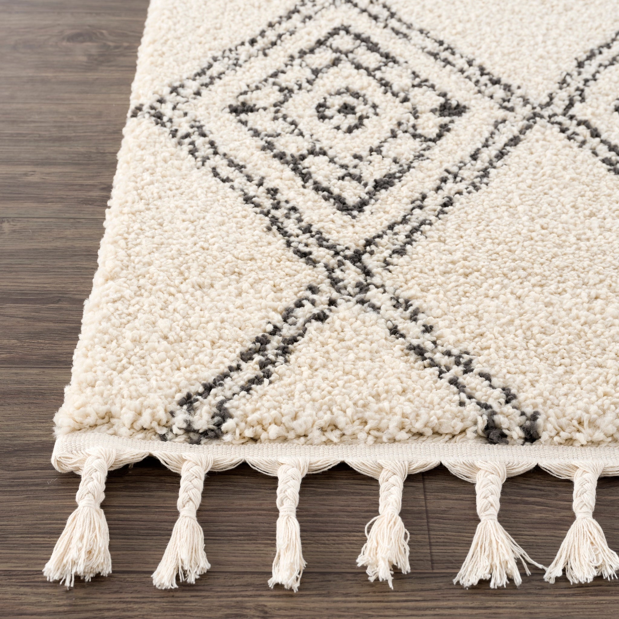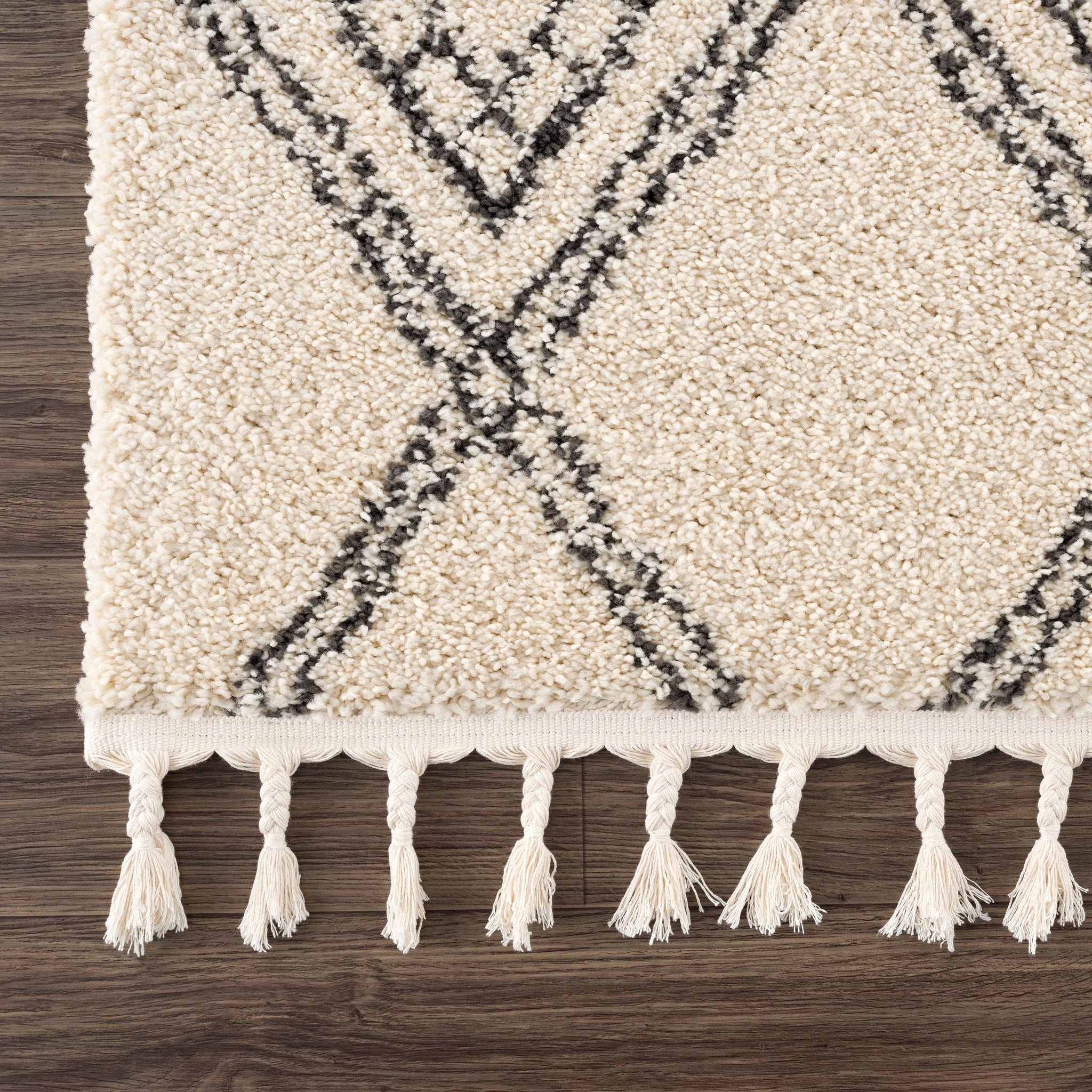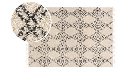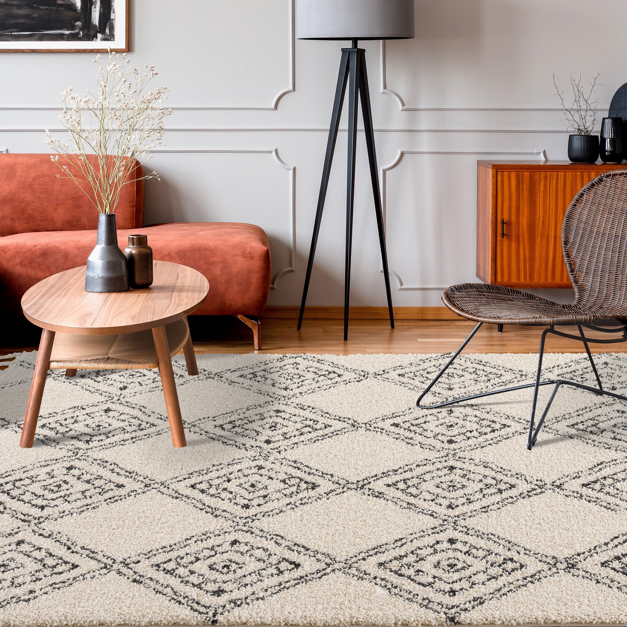 The epitome of neutral shades with a Moroccan motif, our Meru Shag Rug pleases every aesthetic. With a black, whimsical diamond pattern (that almost looks like a hand drawn work of art) atop a cream base, this rug brings undeniable comfort. Perfect in dining rooms, bedrooms, and family rooms because of its super-plush two inch thick pile, this rug will easily fit into your lifestyle.