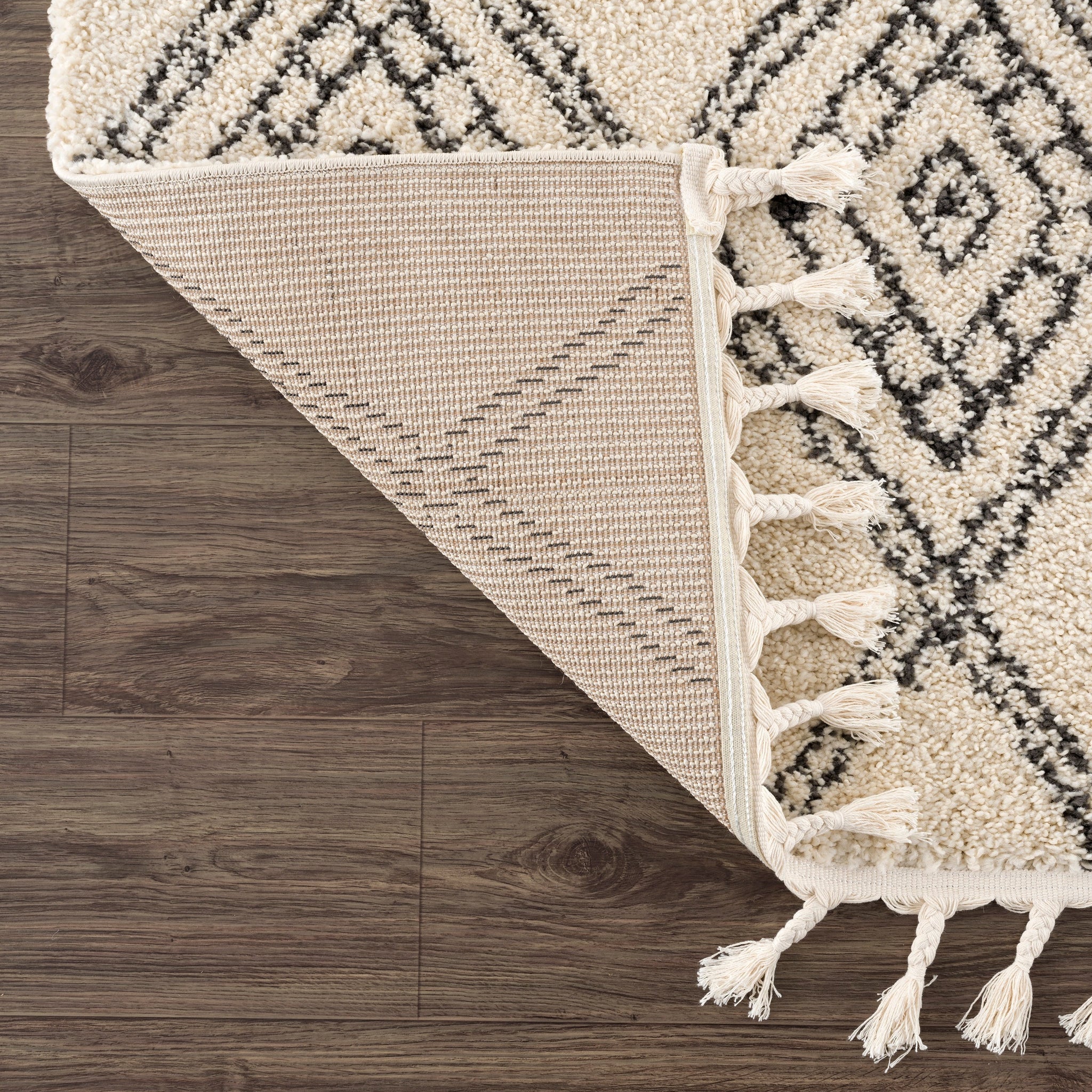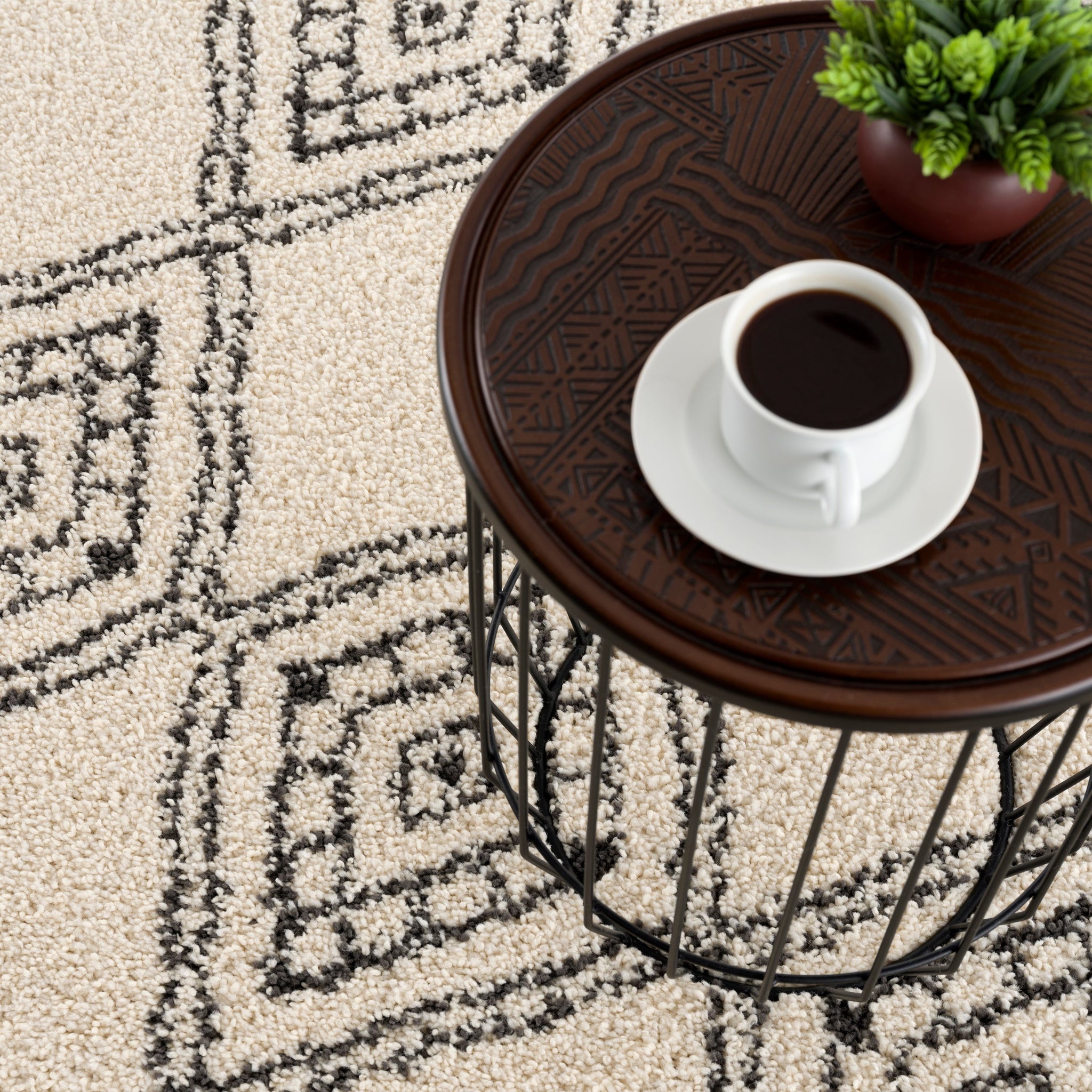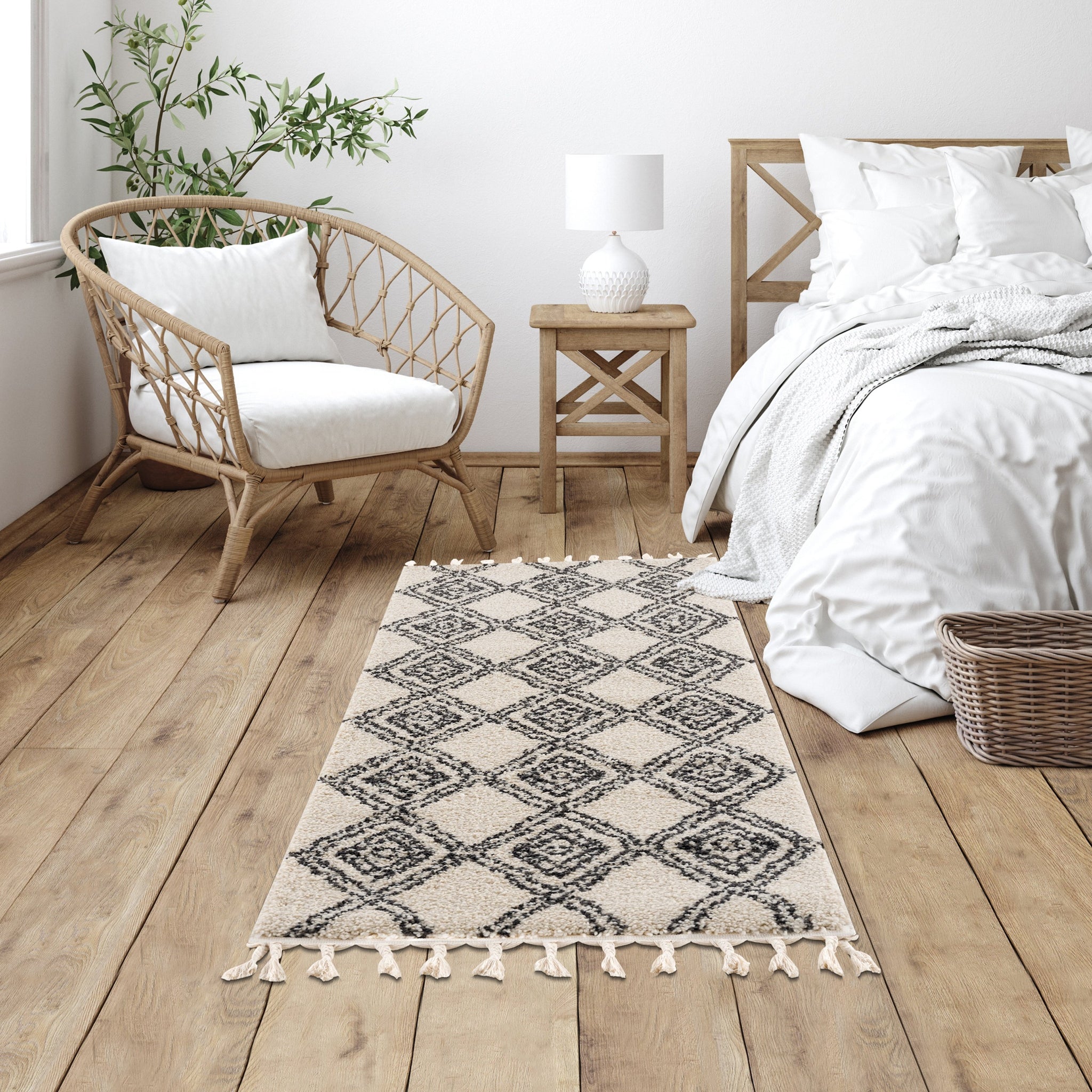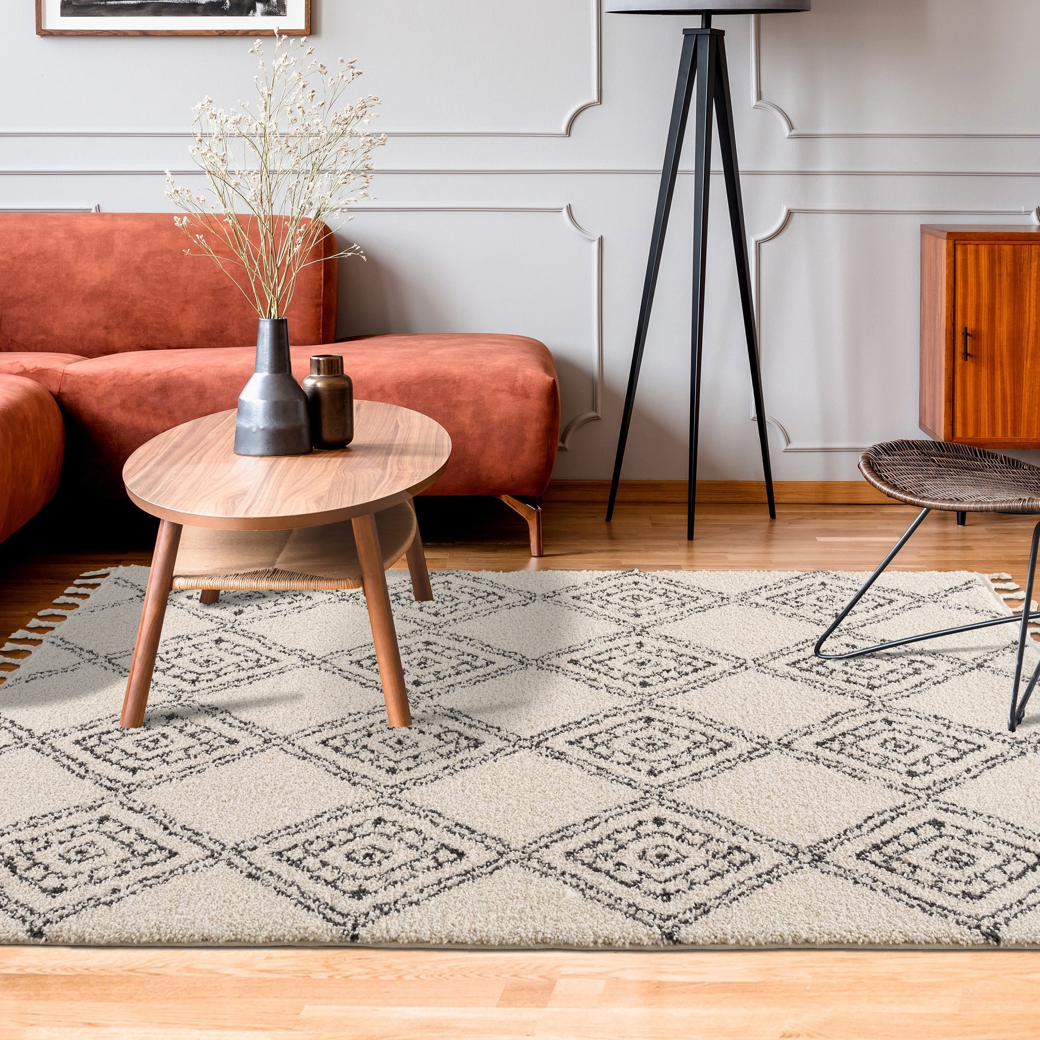 The epitome of neutral shades with a Moroccan motif, our Meru Shag Rug pleases every aesthetic. With a black, whimsical diamond pattern (that almost looks like a hand drawn work of art) atop a cream base, this rug brings undeniable comfort. Perfect in dining rooms, bedrooms, and family rooms because of its super-plush two inch thick pile, this rug will easily fit into your lifestyle.
